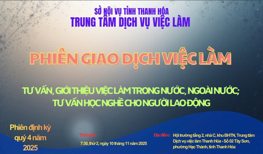 TRUNG TÂM DỊCH VỤ VIỆC LÀM THANH HÓA TỔ CHỨC THÀNH CÔNG PHIÊN GIAO DỊCH VIỆC LÀM ĐỊNH KỲ QUÝ IV...(10/11/2025 2:37 CH)