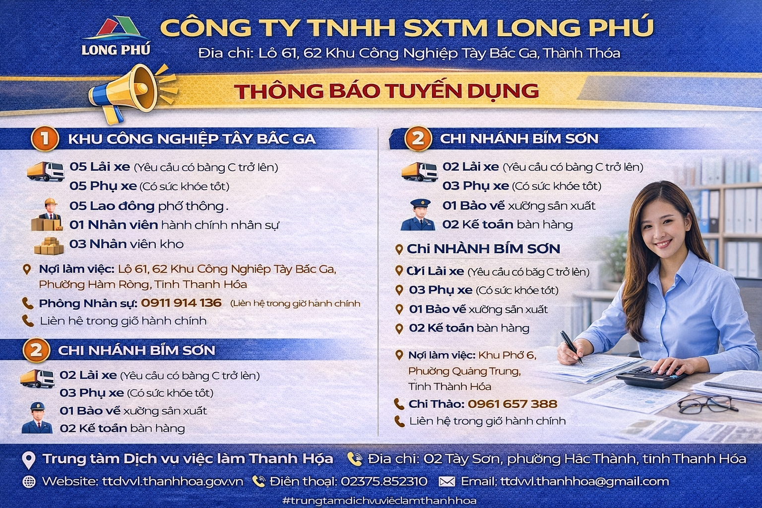 📍 Nơi làm việc: Lô 61, 62 Khu Công Nghiệp Tây Bắc Ga, Phường Hàm Rồng, Tỉnh Thanh Hóa